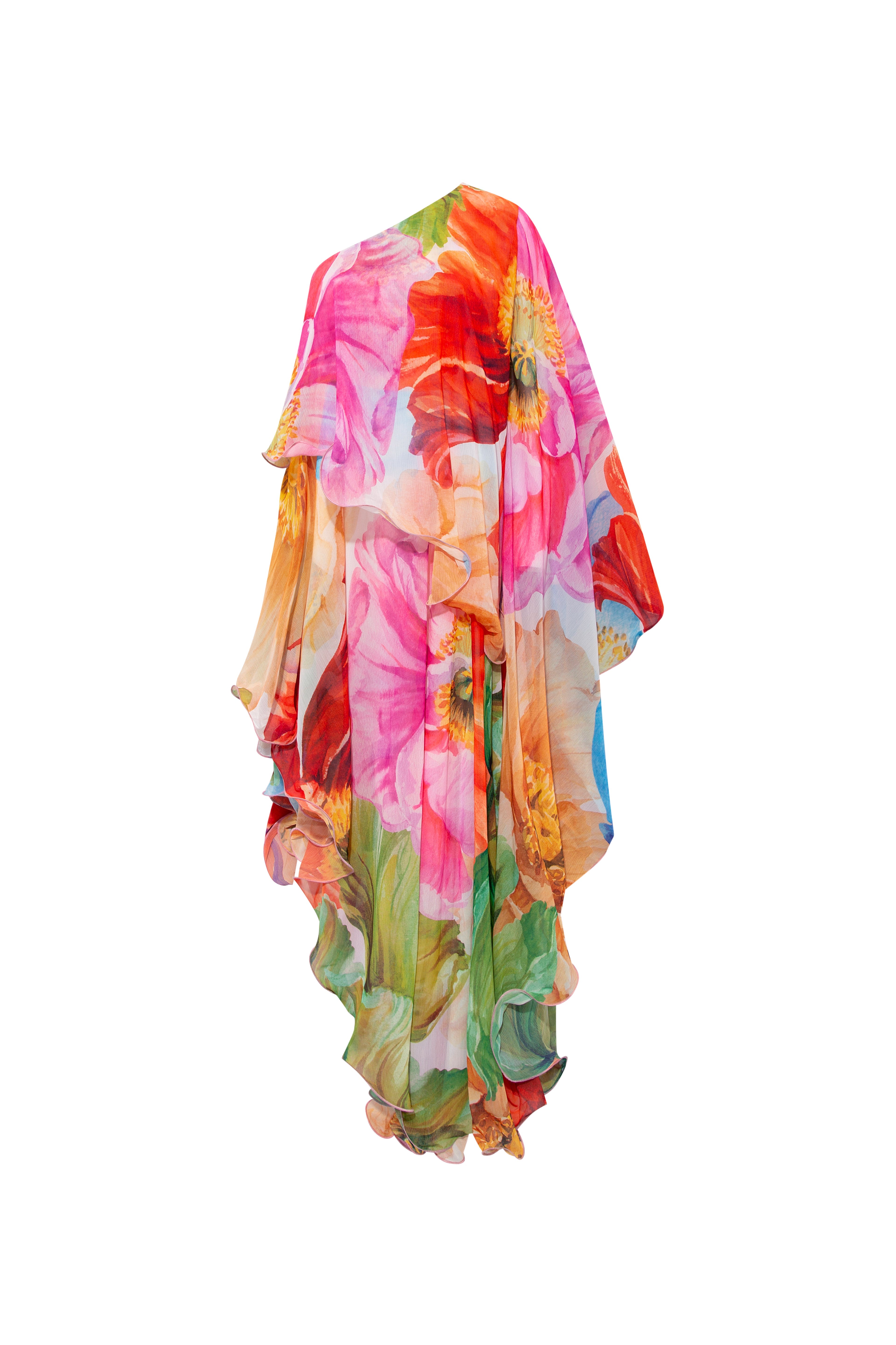 Capture the spirit of romance with the Elle Maxi Dress with its stunning floral print. The flowing cape sleeve adds a touch of drama with one-shoulder design offering a flattering, feminine silhouette look. The playful baby overlock stitching along the hem adds a charming touch, while the flowing volant layer and soft lining ensure both comfort and elegance.