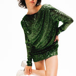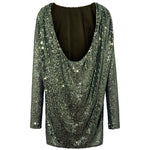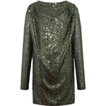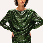 This mini dress features a bicycle neckline and long sleeves for a sophisticated look.