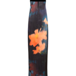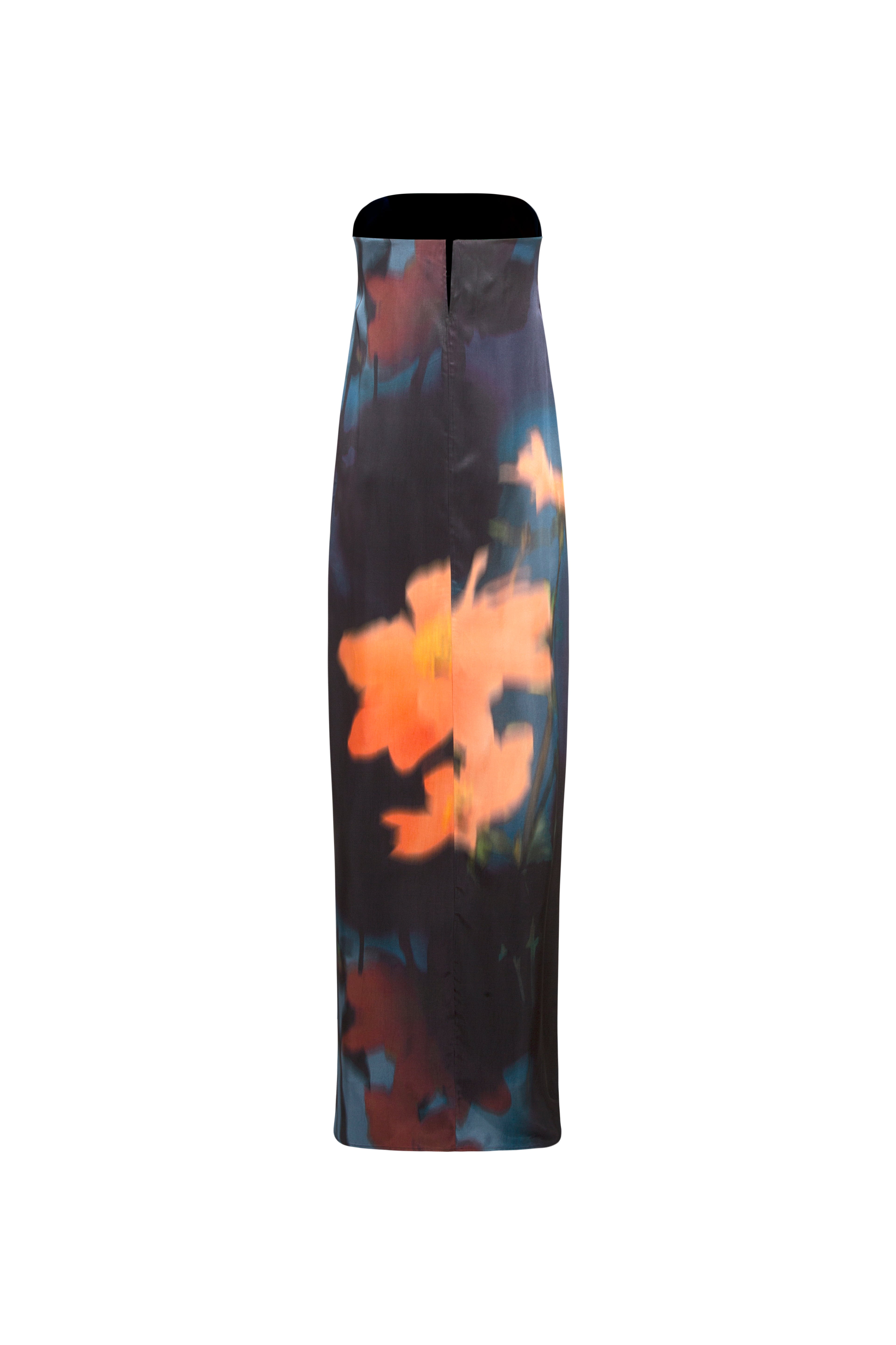 The Nyra Dress is a sophisticated strapless maxi featuring a straight neckline and a relaxed column silhouette. Its bold oversized floral print in dark navy, burnt orange, and coral adds striking elegance, while soft flowing satin fabric ensures graceful movement. Designed with convenient side pockets, this floor-length dress combines effortless style with practical comfort for any refined occasion.