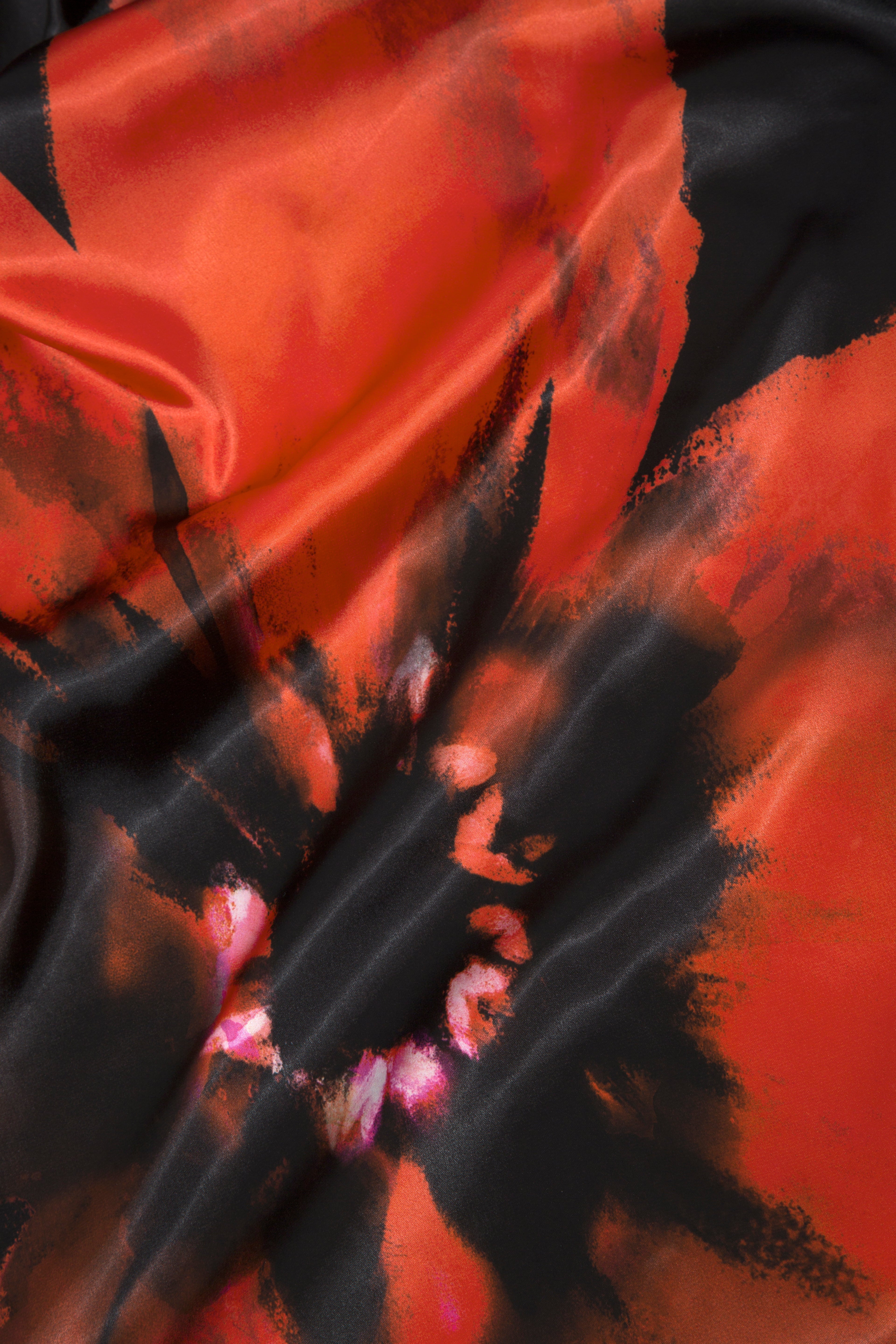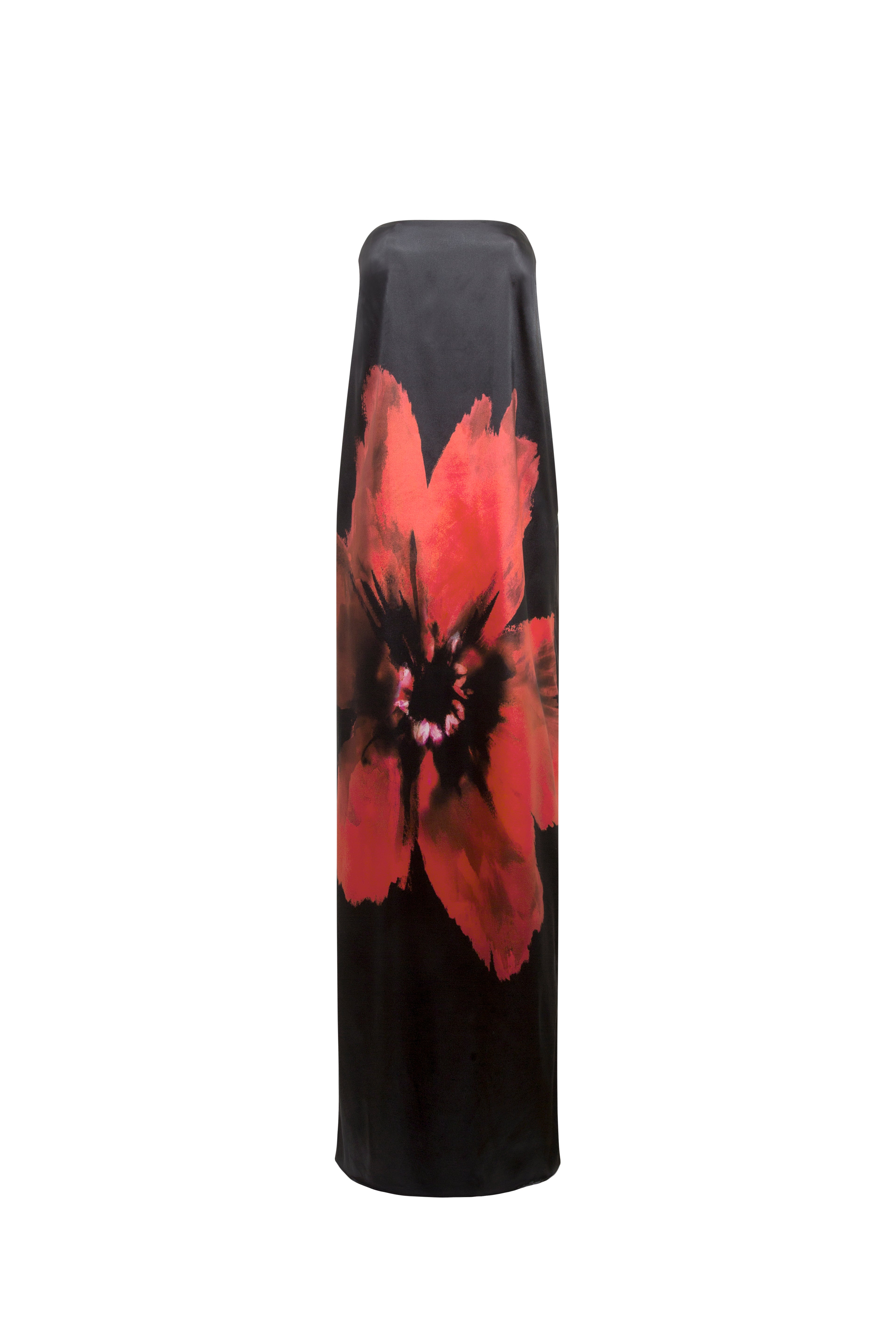Elevate your evening wardrobe with the Pearl Maxi Dress, a strapless floor-length gown showcasing a striking oversized red floral print against a sleek black background. Crafted from soft satin-like fabric, it features a straight neckline, convenient side pockets, and an attached draped cape scarf that adds dramatic flair. This sophisticated design combines elegance and bold style for a memorable high-fashion statement.