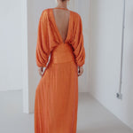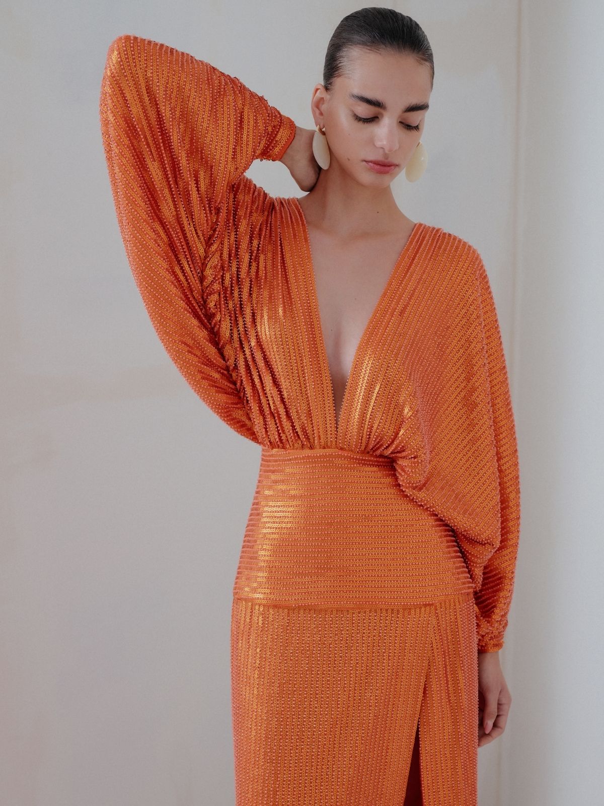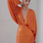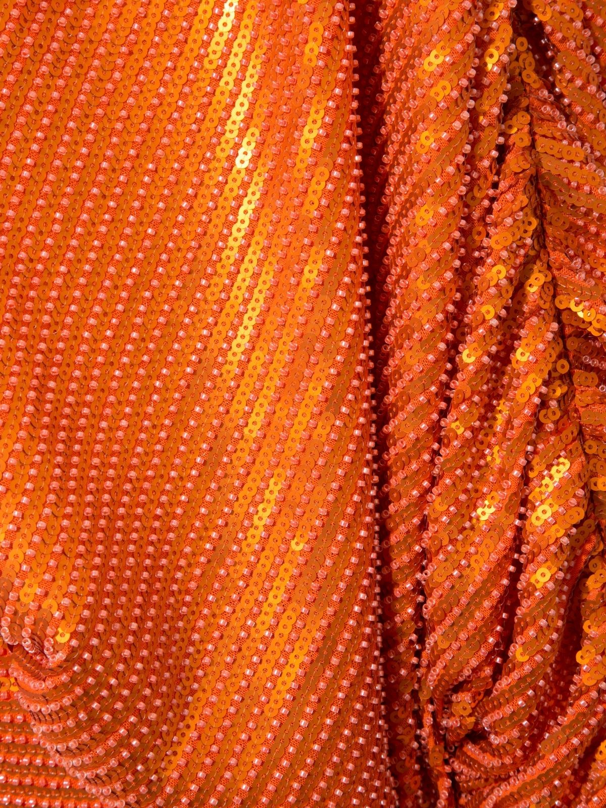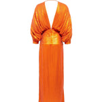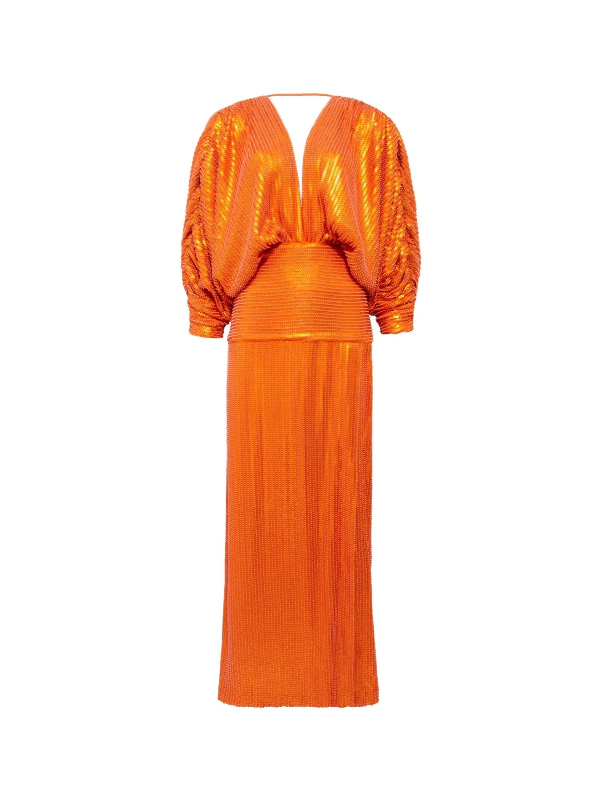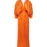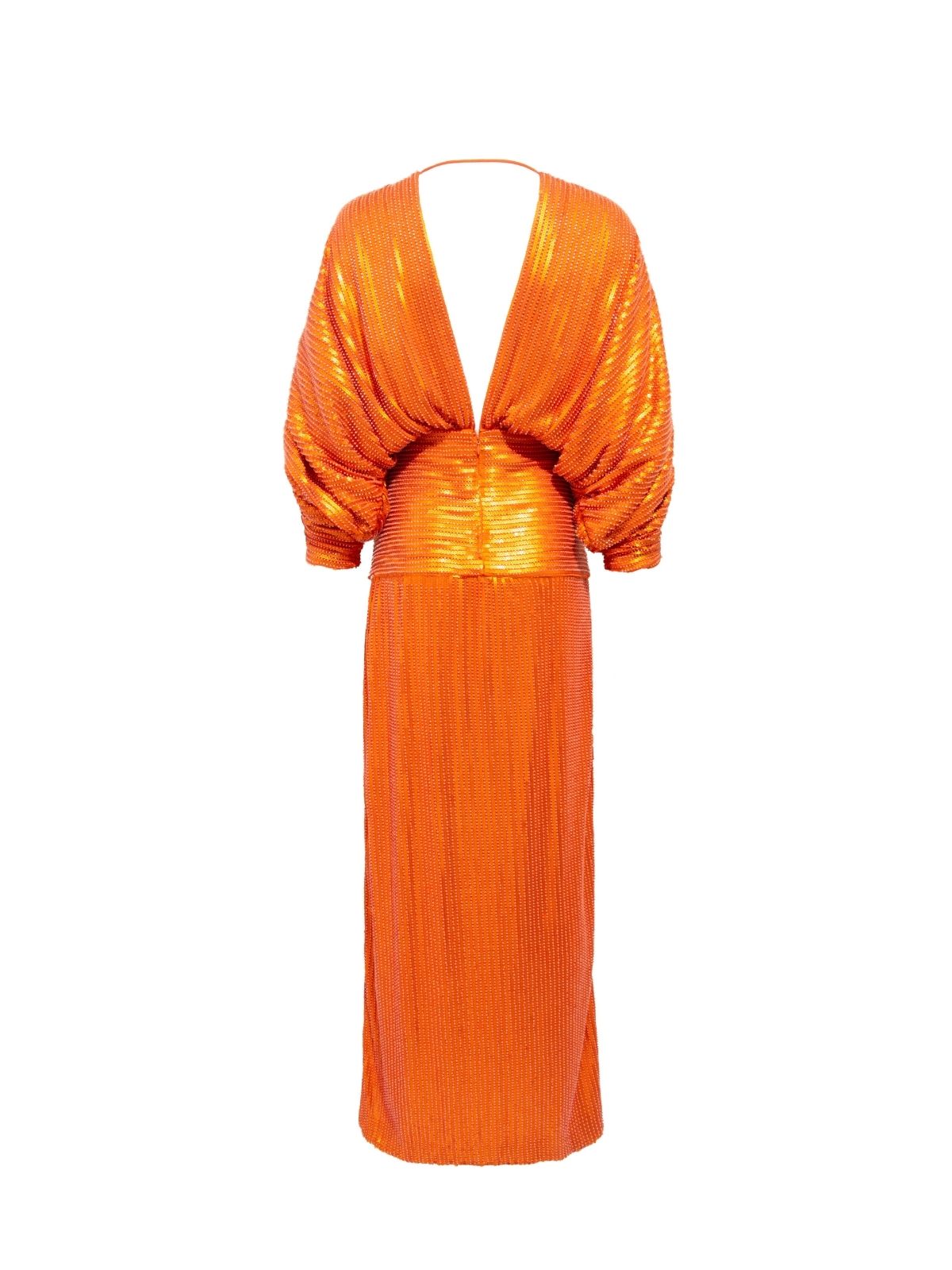 Make a captivating entrance with this long orange sequin dress, designed to shimmer with every step. Fully embellished with luminous sequins, it features elegant V-necklines at both the front and back, enhancing its refined, feminine allure. A subtle slit adds graceful movement and a touch of allure, while the sleek silhouette elongates the figure. Bold yet sophisticated, this statement piece is perfect for unforgettable evening occasions.