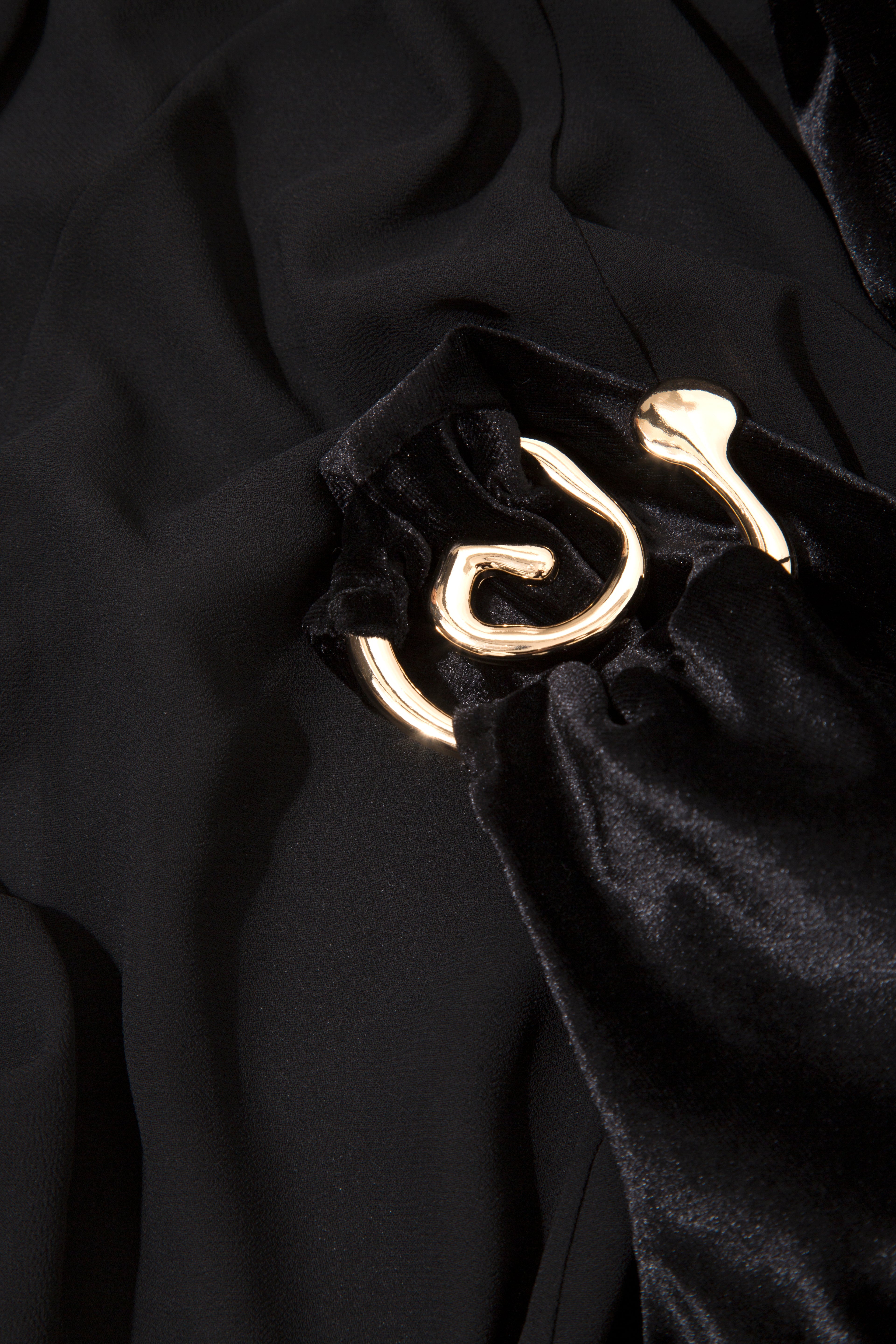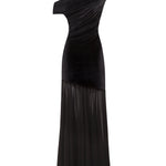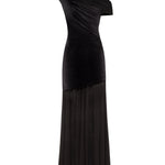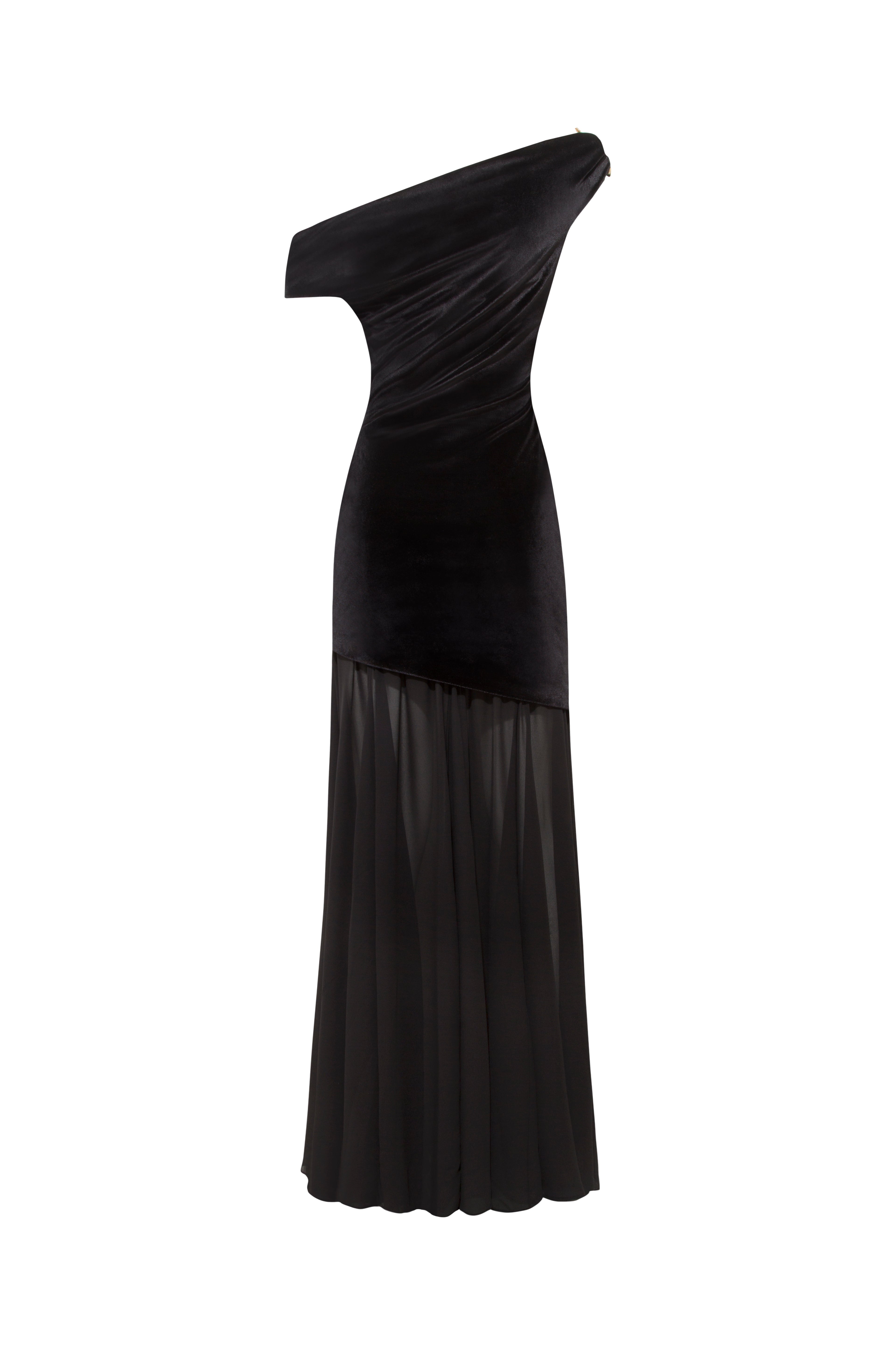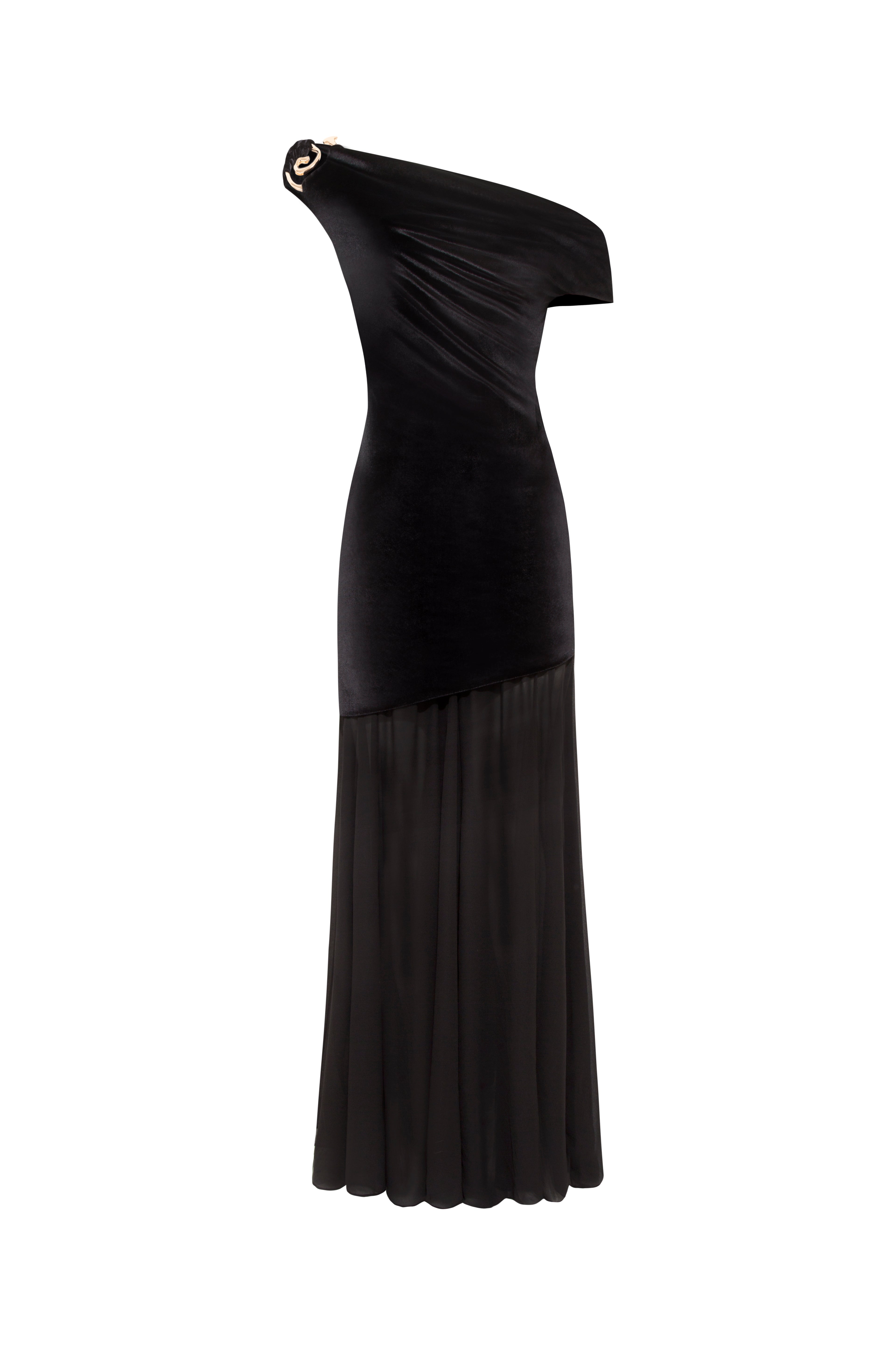 Elevate your evening wardrobe with the Noir Dress, a striking one-shoulder design that seamlessly blends luxury and refinement. Crafted from sumptuous velvet and ethereal chiffon, this piece features an architectural gold accessory detail that adorns the shoulder with understated glamour. The draped fitted bodice creates a flattering silhouette while the soft flowing hem moves with graceful ease. Perfect for galas, formal dinners, or any occasion demanding timeless elegance, this dress transforms you into the focal point of any room.