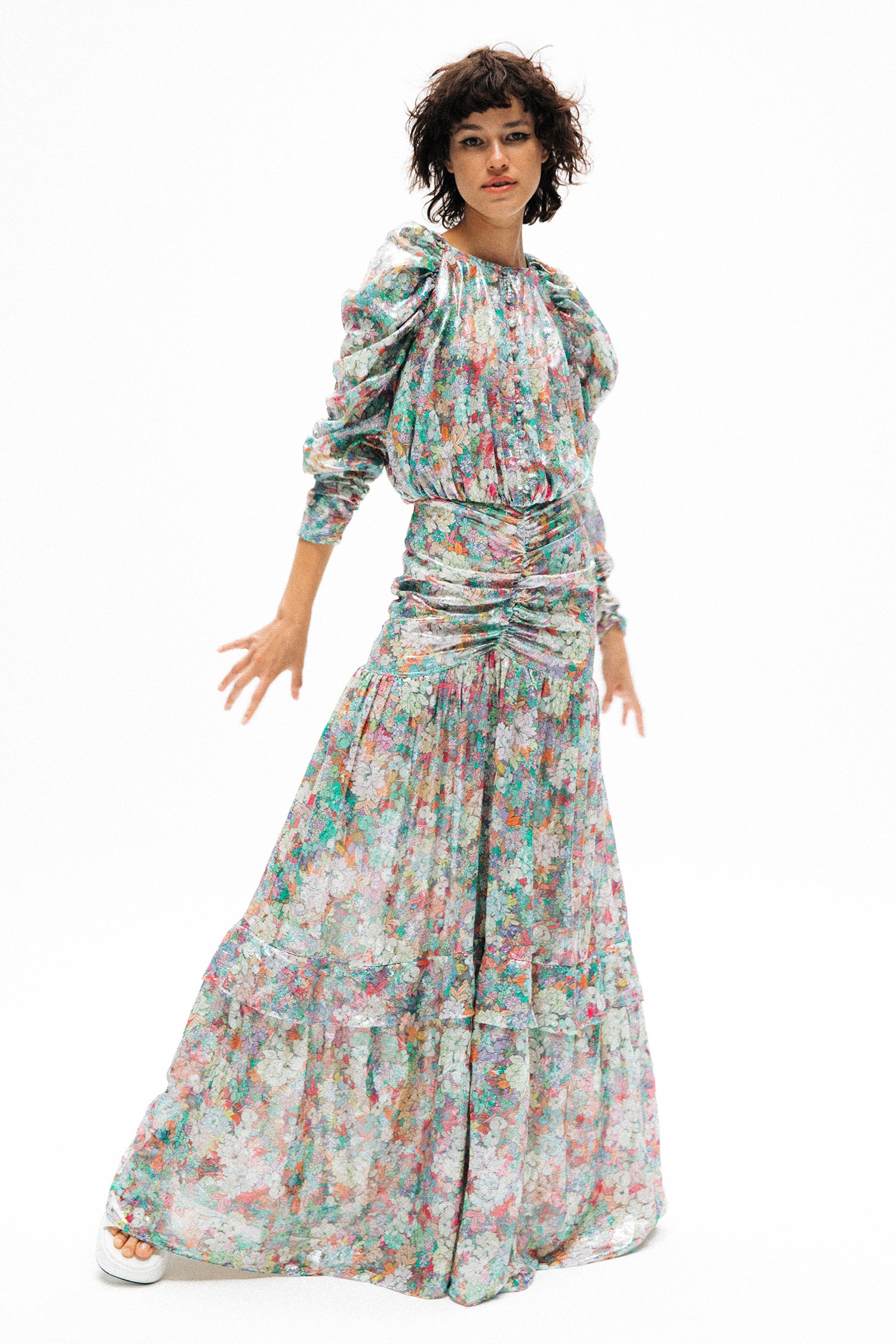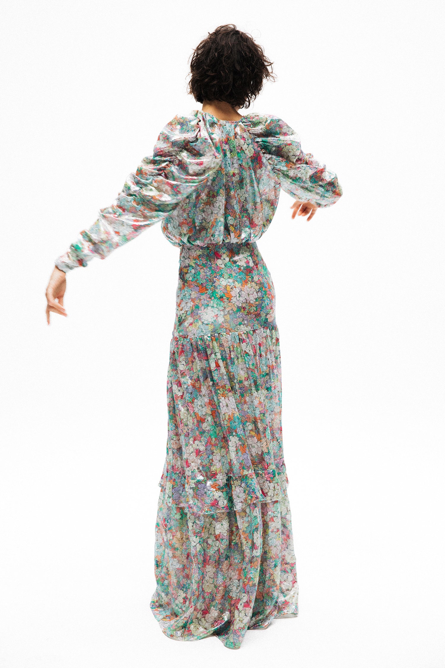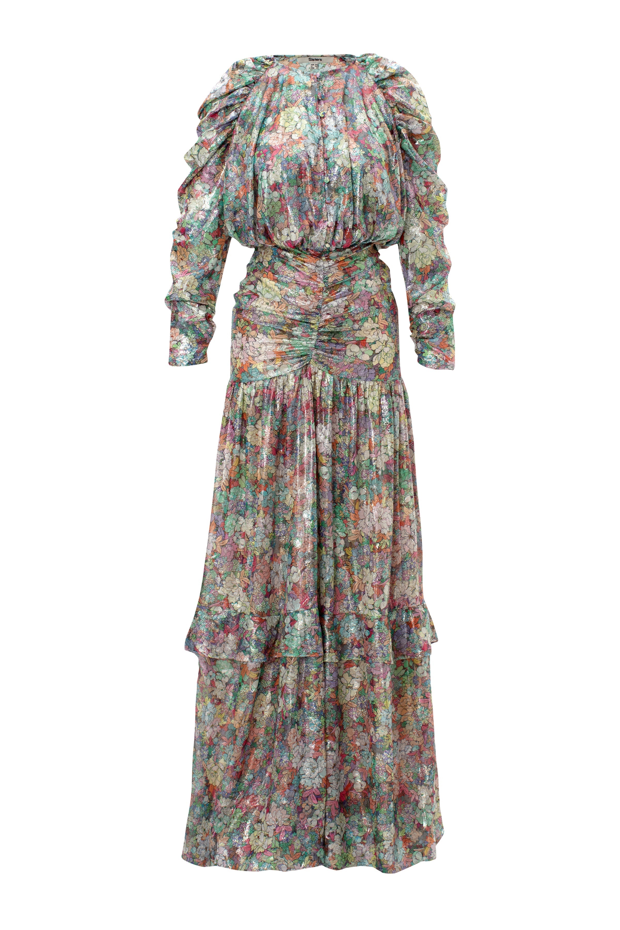 The Greta Dress is a stunning maxi dress adorned with colorful patterns and a bold print. The figure-hugging silhouette is accentuated with a cascading ruffle hem and draped shoulder and sleeve details. Complete with a button front closure and lined for added comfort, this dress is both stylish and practical.